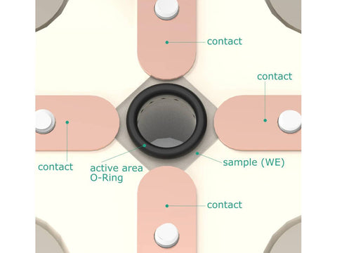 The specific resistivity of arbitrary shape sample can be measured if the following conditions are met: the contacts are at the circumference of the sample, the contacts are sufficiently small, the sample is uniformly thick, and the surface of the sample do not contain any isolated holes. The reference electrode tip should be placed close to the bottom of the chamber (3-5 mm), where the working electrode is exposed to the electrolyte. This will ensure a negligible potential drop throughout the electrolyte solution for low-current experiment. Various auxiliary electrodes are suitable for this cell including metal wire and metal foil electrodes as well as graphite rod. The bubbling of gas through the solution must be stopped prior to experiment.