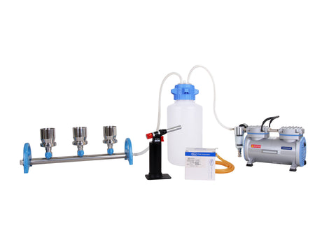 | 00829 180300-22-T | MultiVac 301-MB-T 230 V | Oil free vacuum pump Rocker 400 230 V, manifold MultiVac 301-MB, 3 places spin-lock, 3 x stainless steel filter funnel 100 ml, waste bottel PP 4000 ml, torch burner, MCE membrane, 47 mm, 0.45 μm, 200 pcs./PK, silicone tube (2 m) | Waste bottle: PP, tube: silicone, filter holder: stainless steel | Filtration for microbiology tests, chemical experiments, general laboratory filtration | Funnel with spin-lock connections | Filter holder: 100 ml; waste bottle: 4000 ml | 34 l/min, -680 mmHg | €2,981.26 |