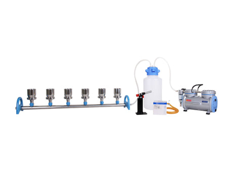 | 00829 180600-22-T | MultiVac 600-MB-T 230 V | Oil free vacuum pump Rocker 400 230 V, manifold MultiVac 601-MB, 6 places spin-lock, 6 x stainless steel filter funnel 100 ml, waste bottle PP 4000 ml, torch burner, MCE membrane, 47 mm, 0.45 μm, 200 pcs./PK, silicone tube (2 m) | Waste bottle: PP, tube: silicone, filter holder: stainless steel | Filtration for microbiology tests, chemical experiments, general laboratory filtration | Funnel with spin-lock connections | Filter holder: 100 ml; waste bottle: 4000 ml | 34 l/min, -680 mmHg | €4,663.4 |